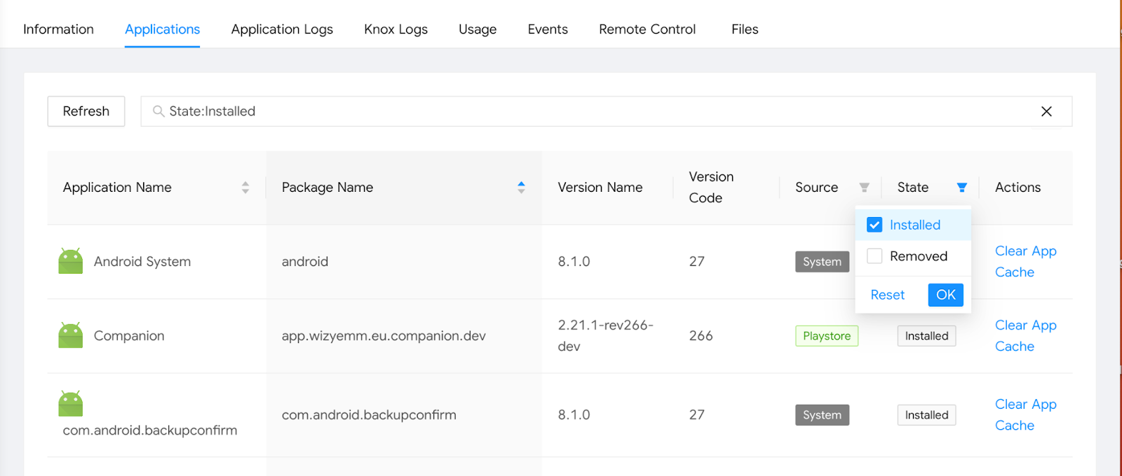 Select "Removed" from the filter options to display all applications that have been removed from the device.