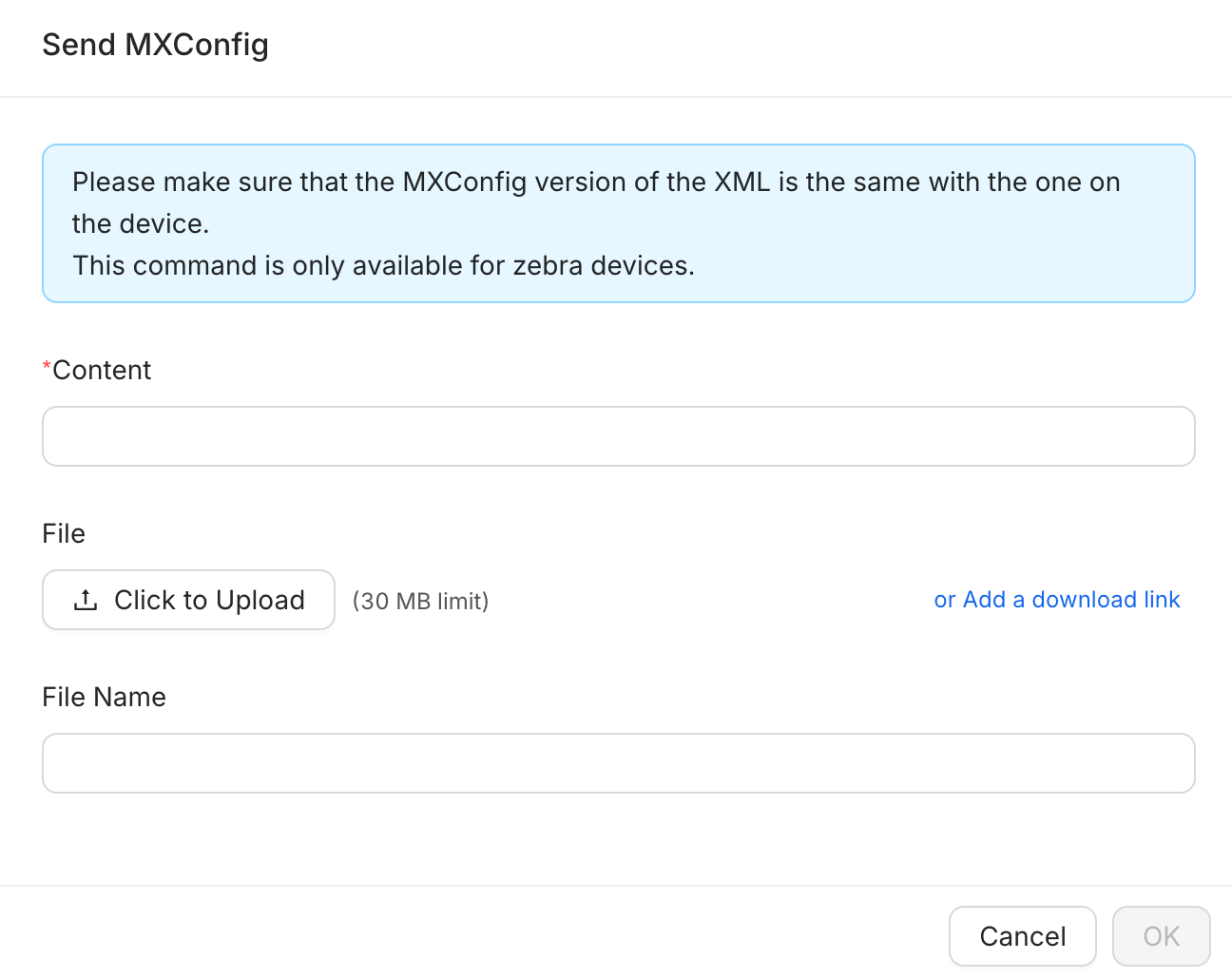 We have added the Send MXConfig Command, allowing administrators to easily send XML configurations directly to their Zebra devices. This powerful new command enables you to push specific device settings, profiles, and configurations, which streamlines your management workflows and ensures consistent configurations across your Zebra device fleet.