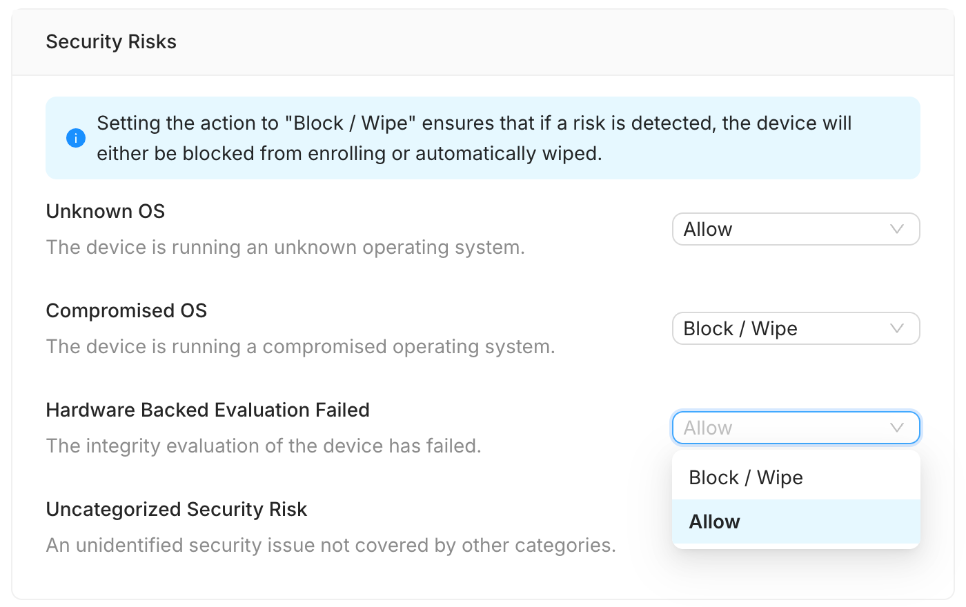 For each risk category (e.g., Compromised OS), select the desired action from the dropdown menu: Allow or Block / Wipe.