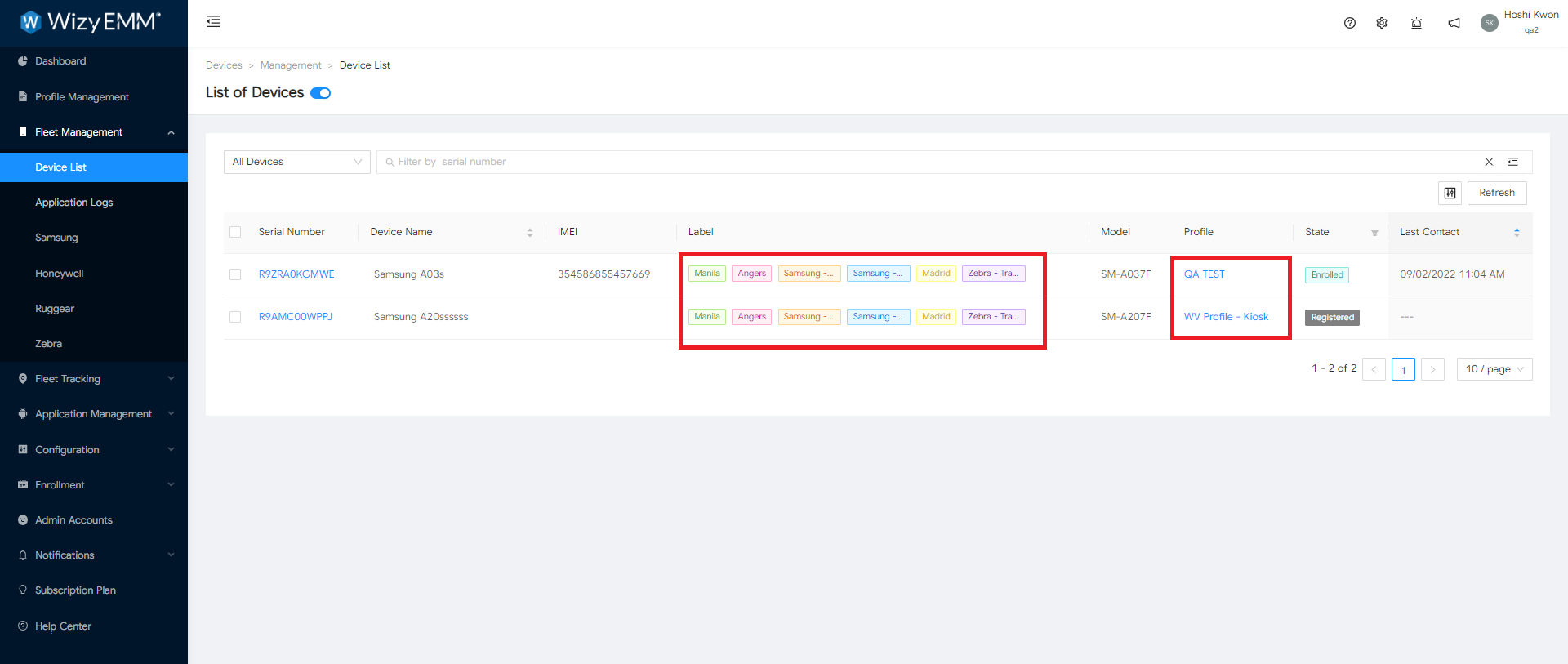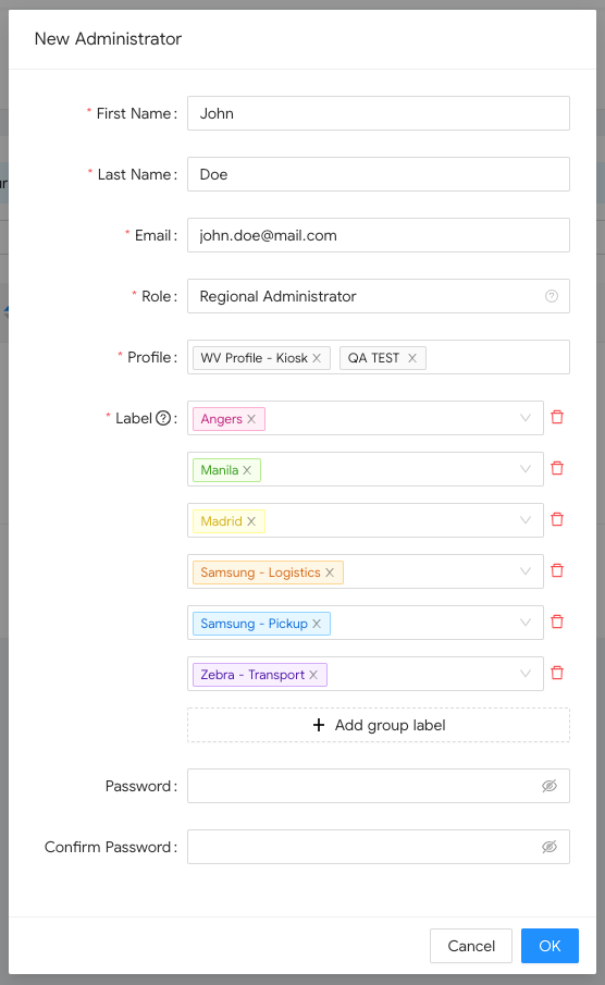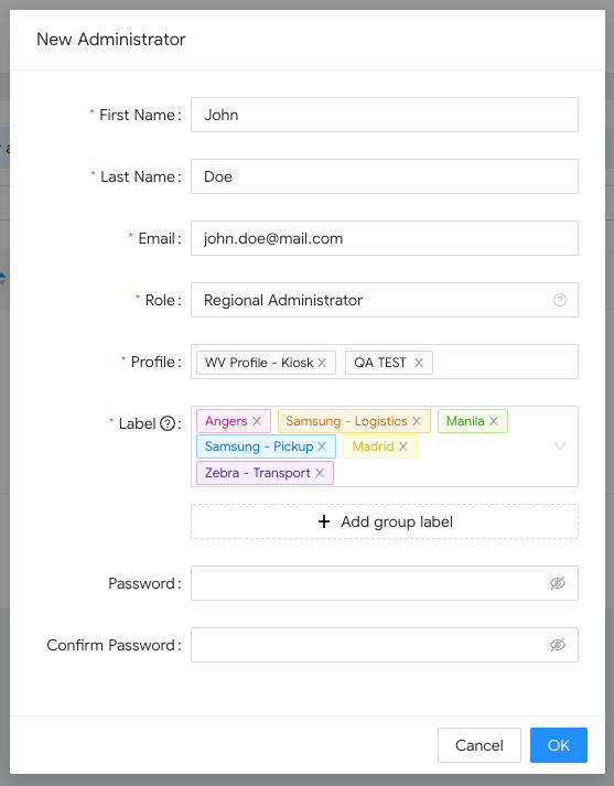 El Administrador Regional tendrá acceso a las 6 etiquetas y podrá ver los dispositivos vinculados a Manila O Angers O Madrid O Samsung - Logística O Samsung - Recogida O Zebra - Transporte.