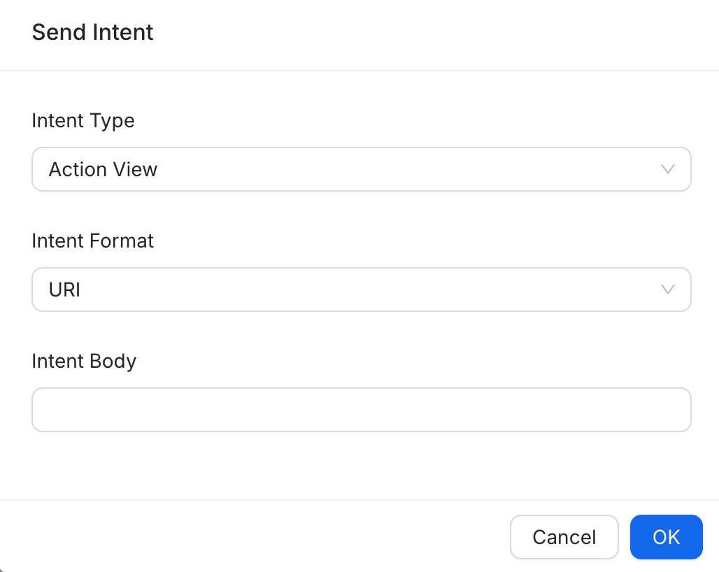 Sélectionnez Envoyer Intent dans la liste des commandes disponibles.